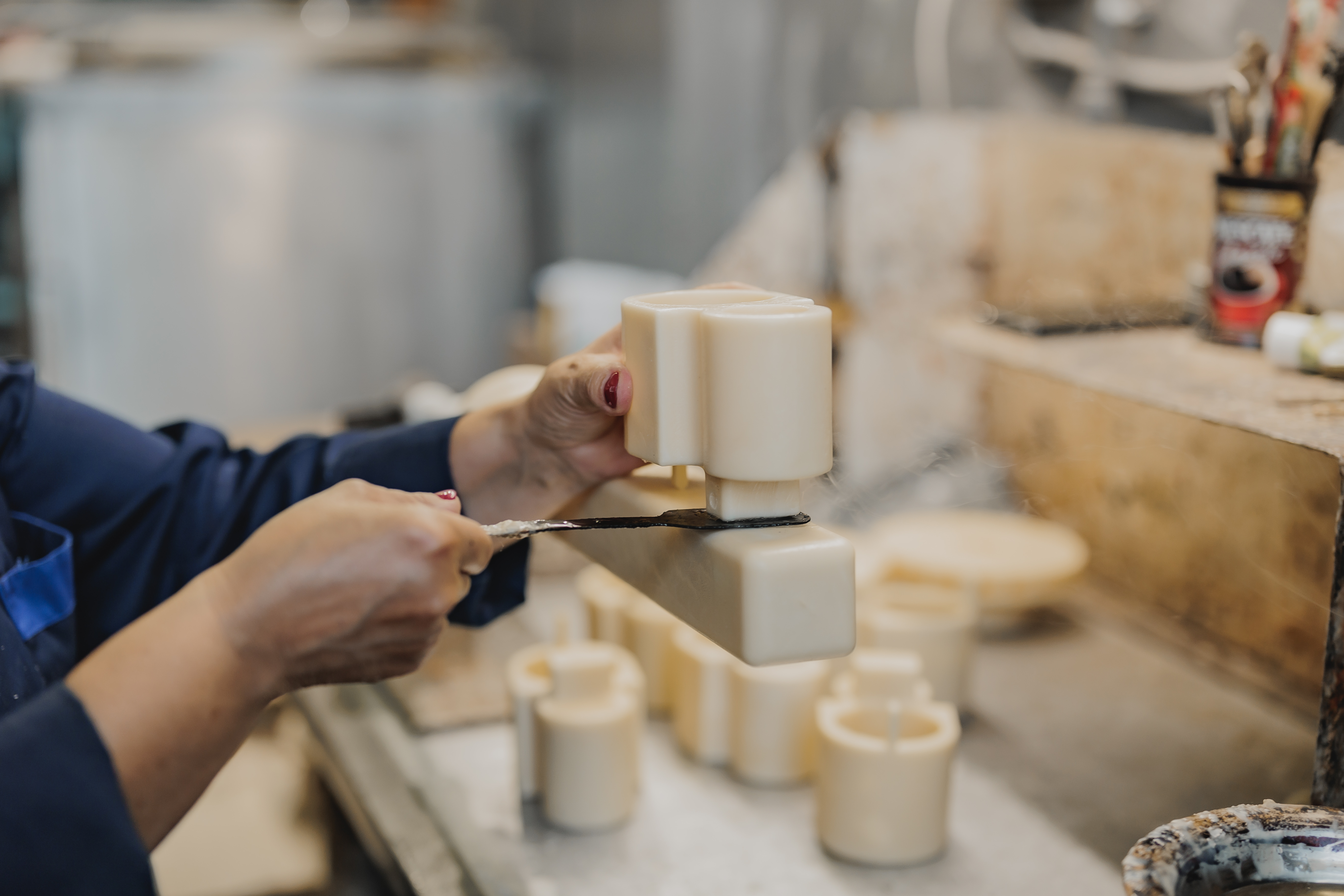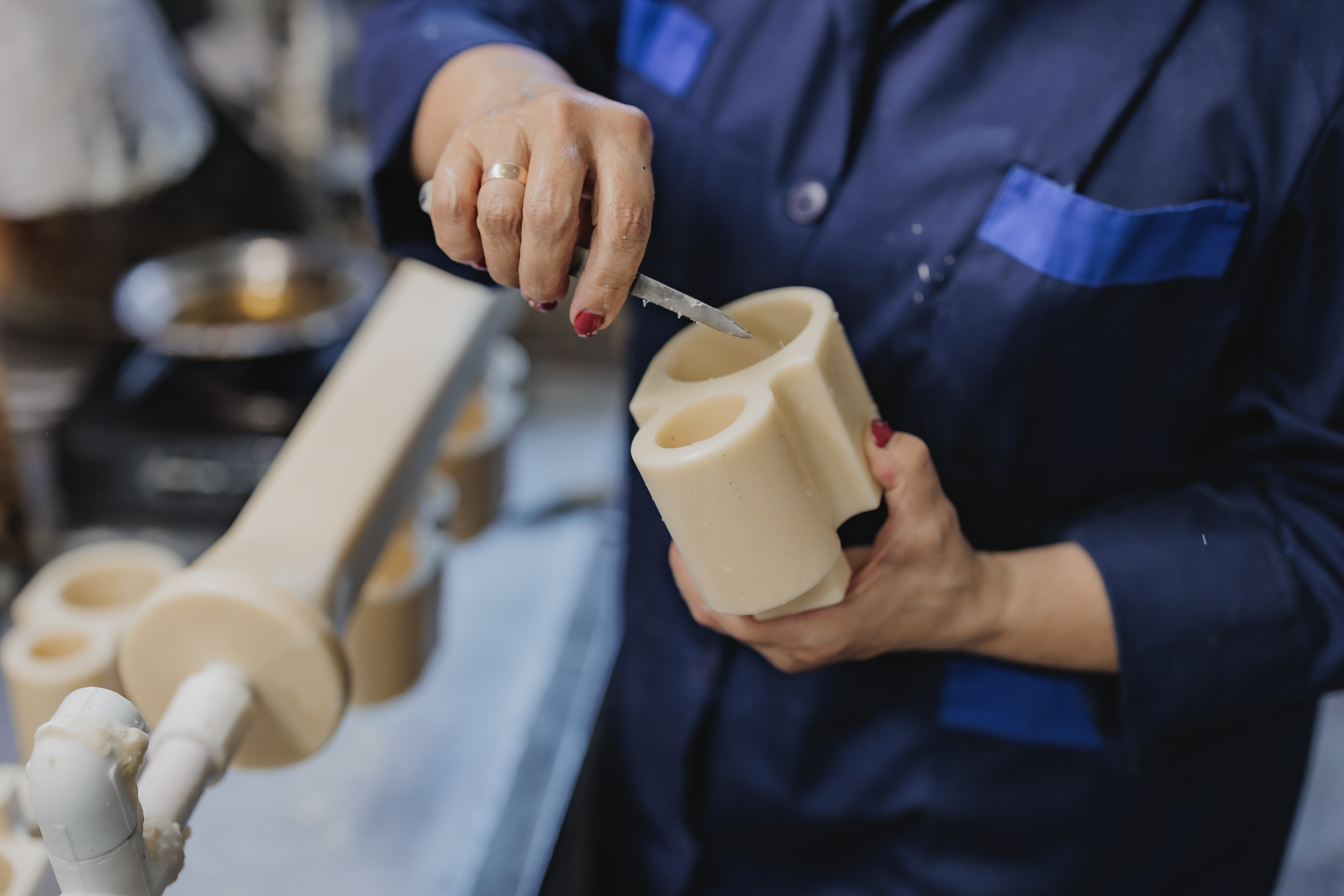 Для создания точной восковой модели используют специализированную шприц-машину. Процесс начинается с подготовки воска: он нагревается до нужной температуры, попадает в десятиступенчатую шестерёнчатую мешалку, смешивается с определённым количеством воздуха, охлаждаясь при этом до пастообразного состояния и загружается в специальный резервуар шприц-машины. Оператор включает устройство, и воск под давлением через нагретый нагнетательный цилиндр поступает в пресс-форму. После того как воск полностью заполнил форму и достиг необходимой плотности, он охлаждается и застывает внутри пресс-формы. После застывания восковую заготовку аккуратно извлекают из пресс-формы. Далее восковая модель зачищается и собирается из отдельных элементов: к восковому коллектору крепят конструкцию из восковой модели и восковых прибылей.