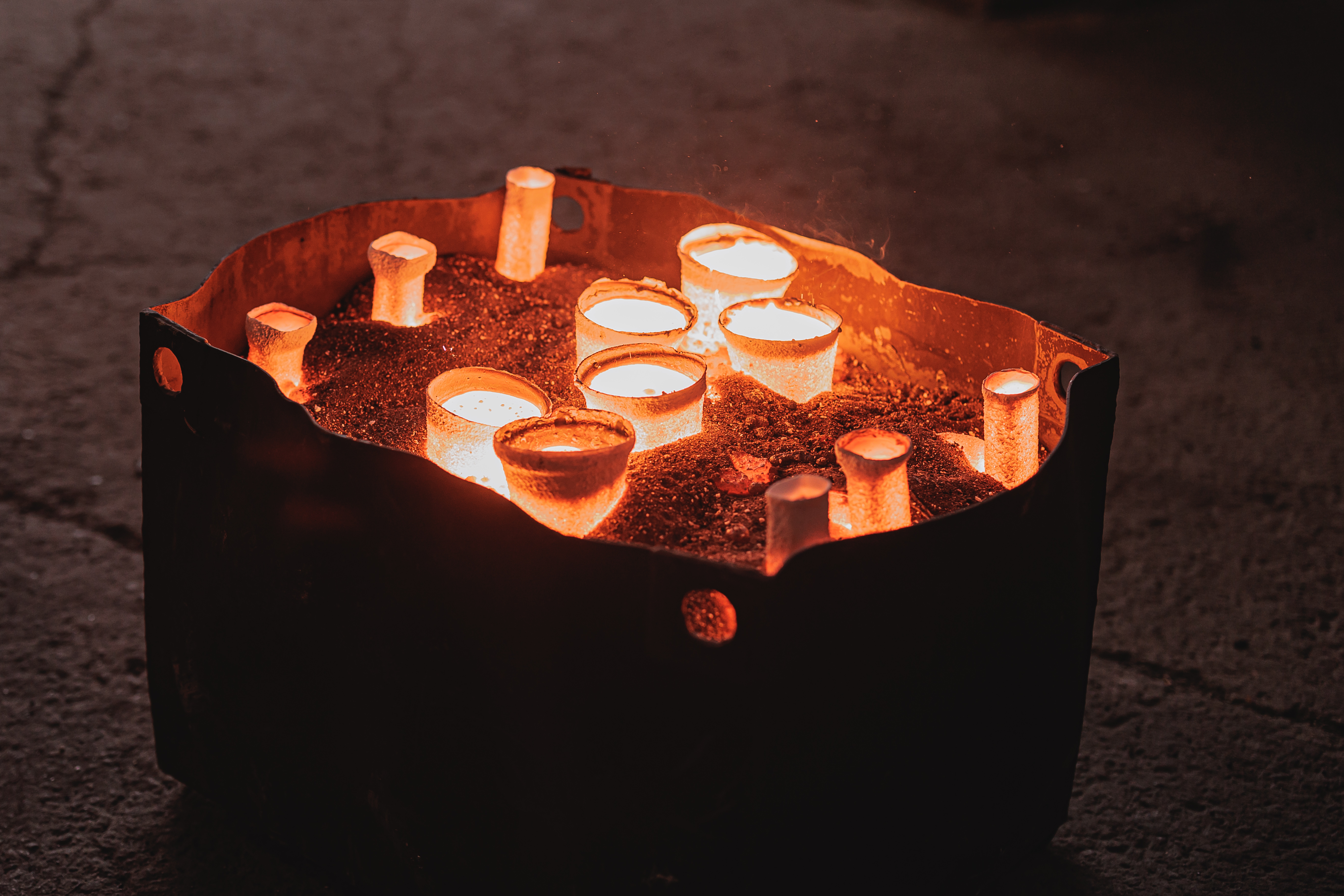 Расплавленный металл заливают в подготовленную форму через специальные отверстия. После заливки металл оставляют остывать.